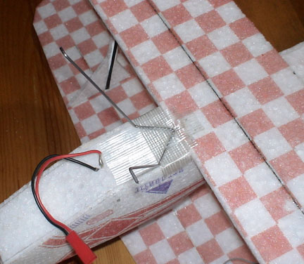 次にサーボをマウントします。ここではサーボマウントも余りのEPPを使ってつくりました。ここではエレボン+ラダーという構成を狙って製作しています。